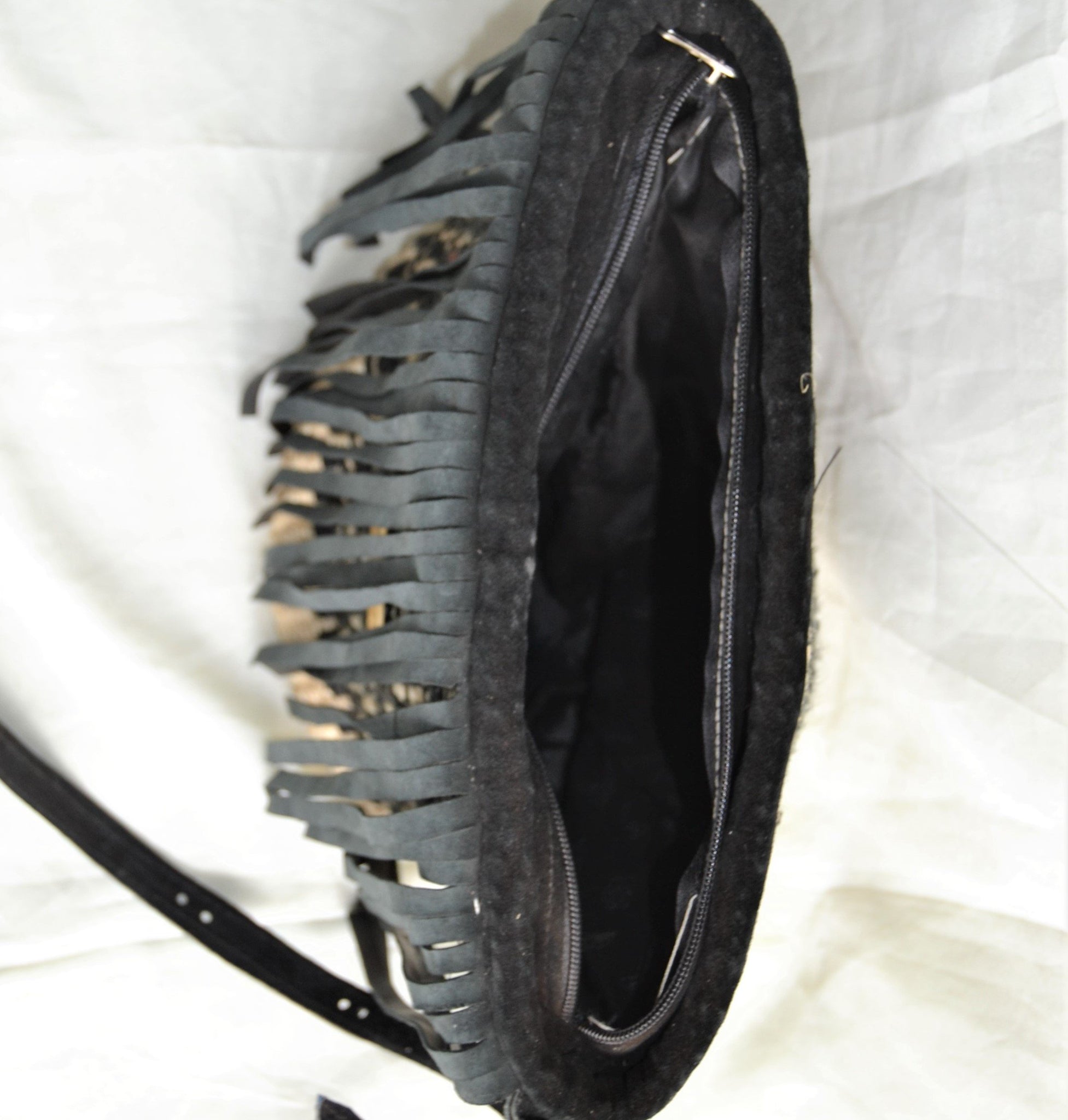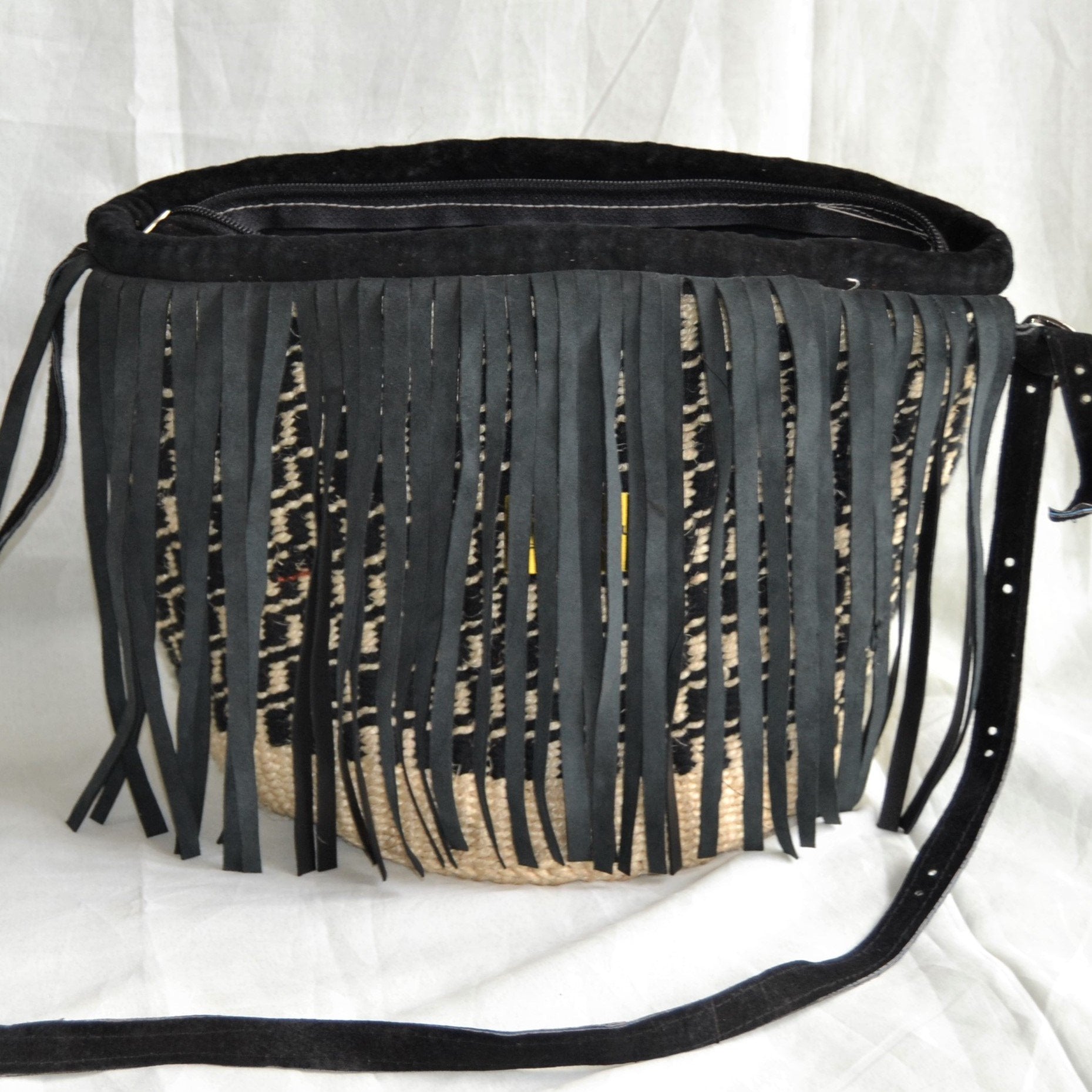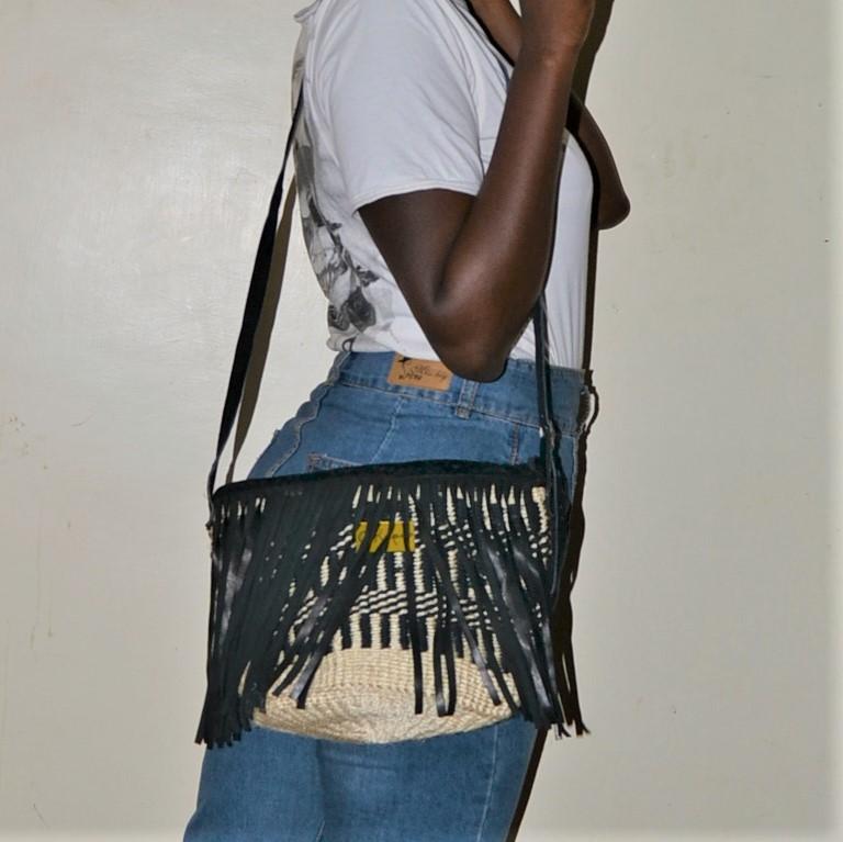 Nothing screams fashion like a fringed bag. This sling is crafted by weaving black yarn with sisal to make a pleasantly patterned kiondo. Its leather trimmings include a zip closure with draping fringes, an adjustable strap to carry it over your shoulder or across your body. Due to its small size, this makes for an excellent everyday bag for those with little baggage. It would also be a great compliment to your festival outfit.