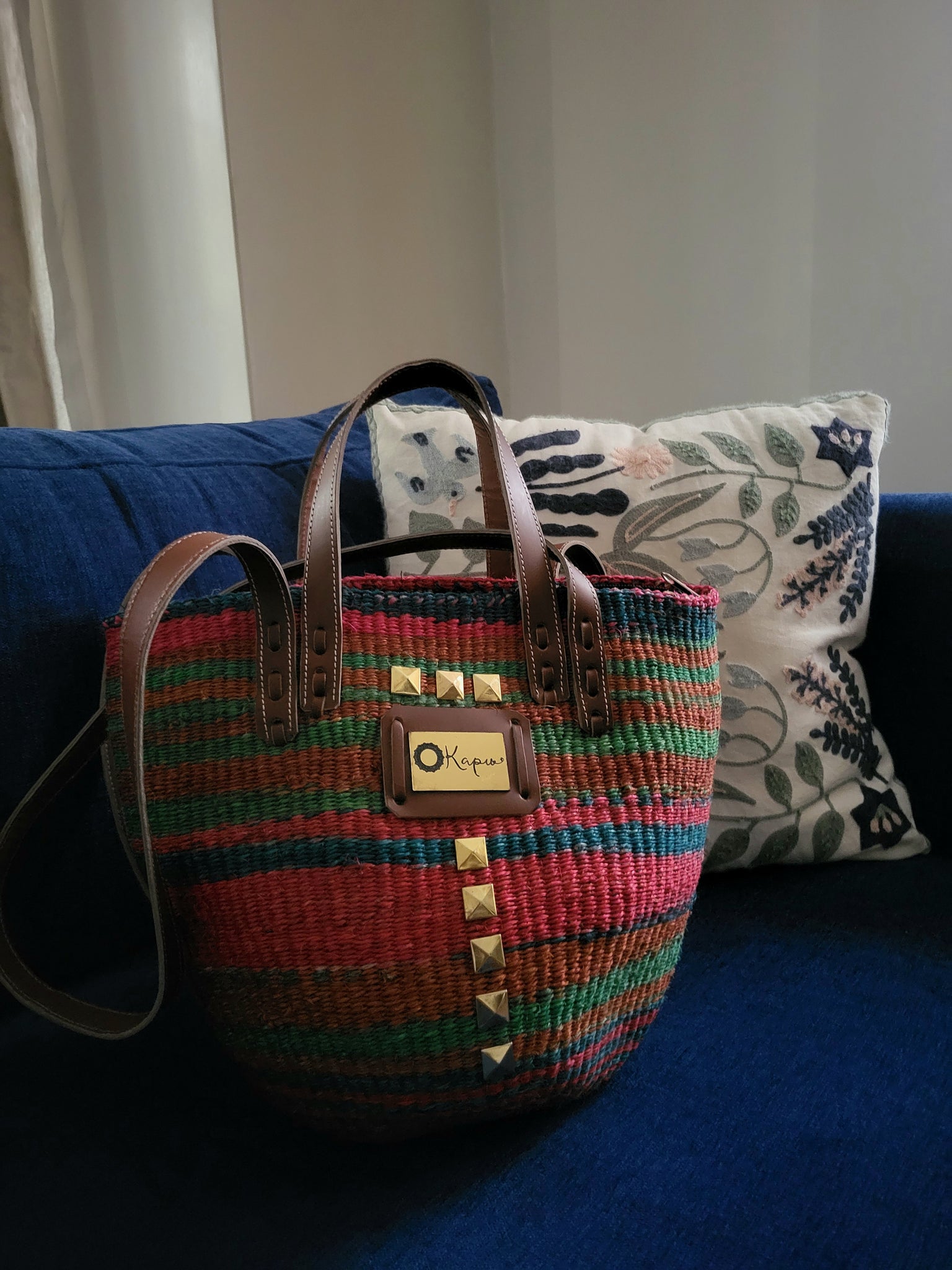 This is not just a bag, but a piece of art, set to upgrade your casual fit to a show-stopper. The traditional technique used in weaving this kiondo, is called mawingu which translates to 'cloudy formations'. Sisal fibres are dipped in different colors of vegetable dye before weaving to create beautifully blended entanglements of color. The bag is embellished with gold-toned studs for that extra Okapu sass. Its leather trimmings include both top handles and shoulder straps. You may carry it over your shoulder or easily grab the top handles with your hands. Due to its medium size, this makes for an excellent bag for the day.