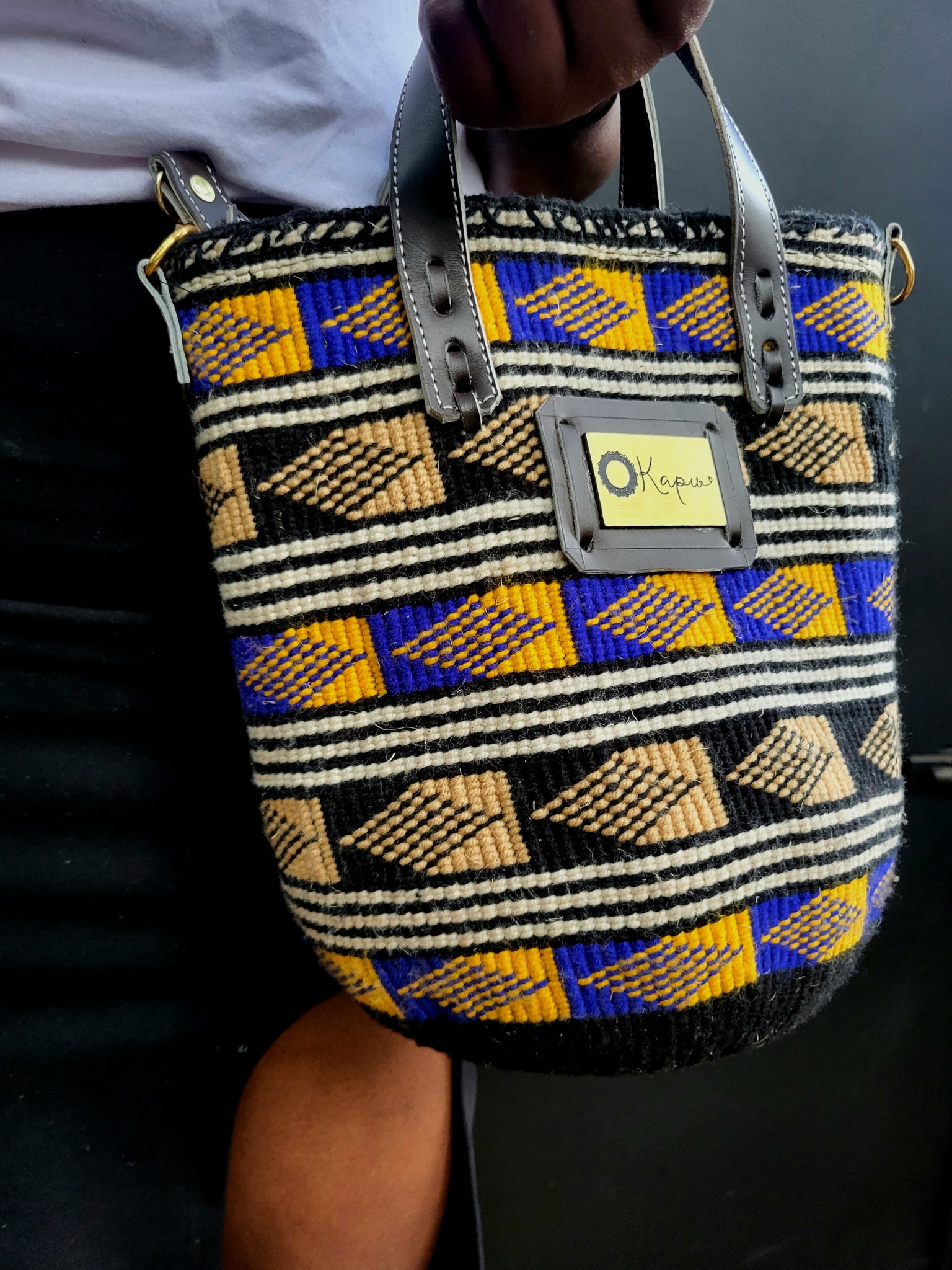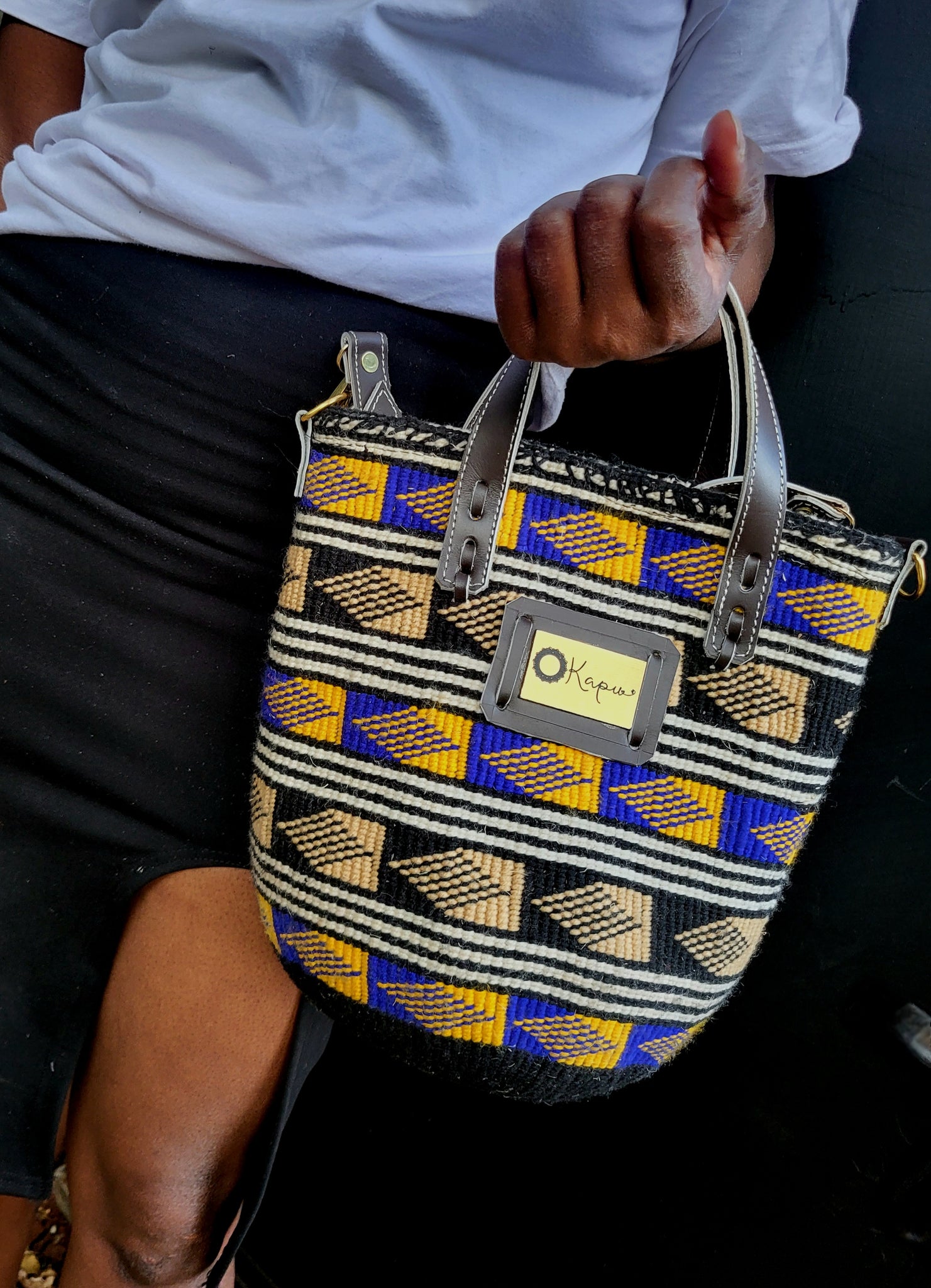 The Dallah Top-handle kiondo is a stylish and versatile dual-carry bag made from woven yarn and sisal fibers. Its colorful and intricate design adds a unique touch to any outfit, making it perfect for any fashion-forward individual.
